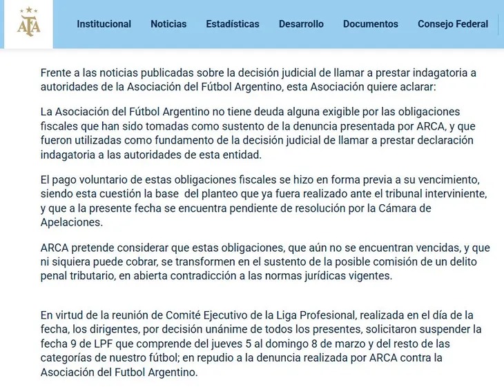 El Comité Ejecutivo de la Asociación del Fútbol Argentino (AFA) resolvió decretar un paro de cuatro días y suspender la fecha 9 de la Liga Profesional de Fútbol en repudio a una denuncia presentada por la Agencia de Recaudación y Control Aduanero (ARCA) por presunta deuda impositiva.
